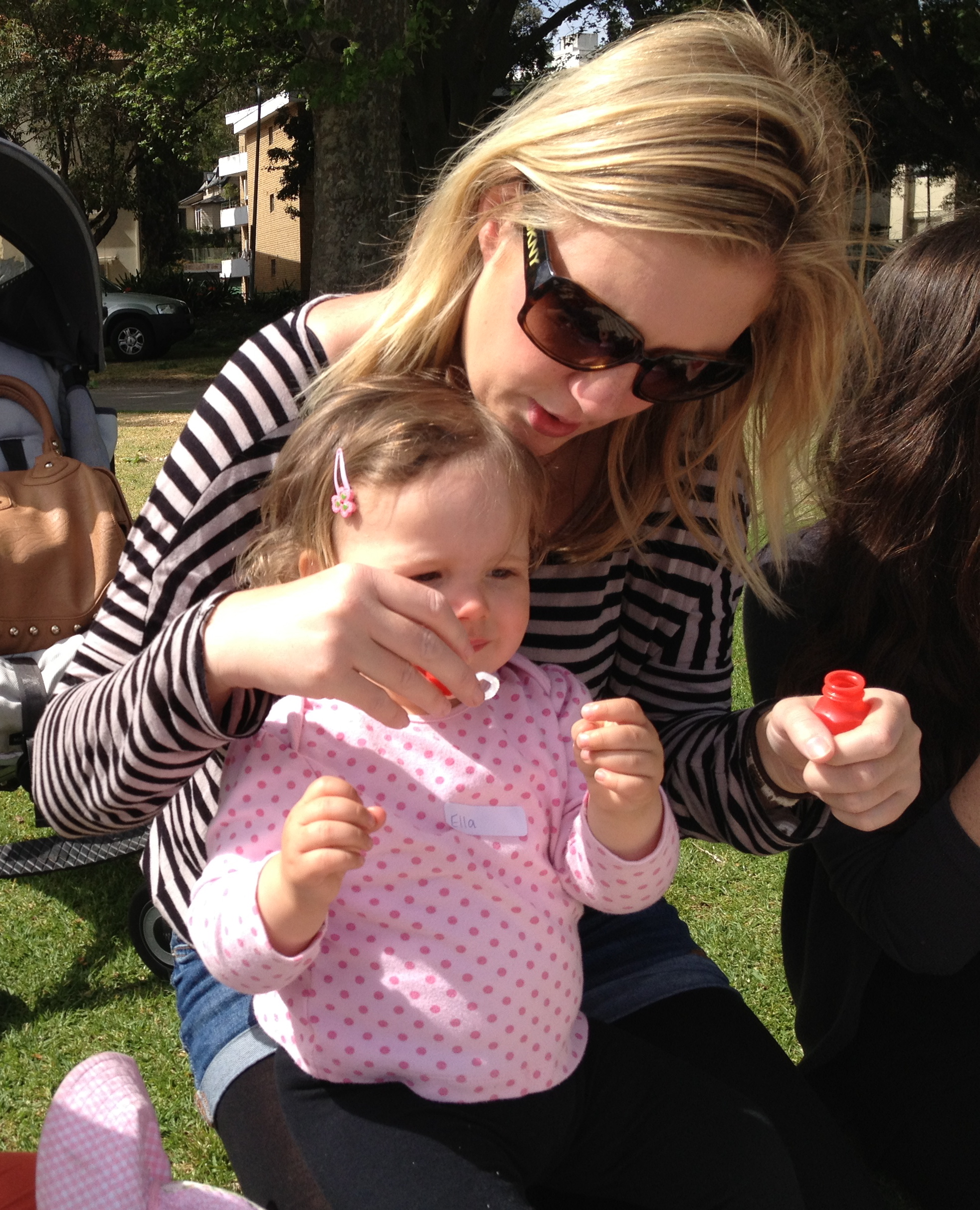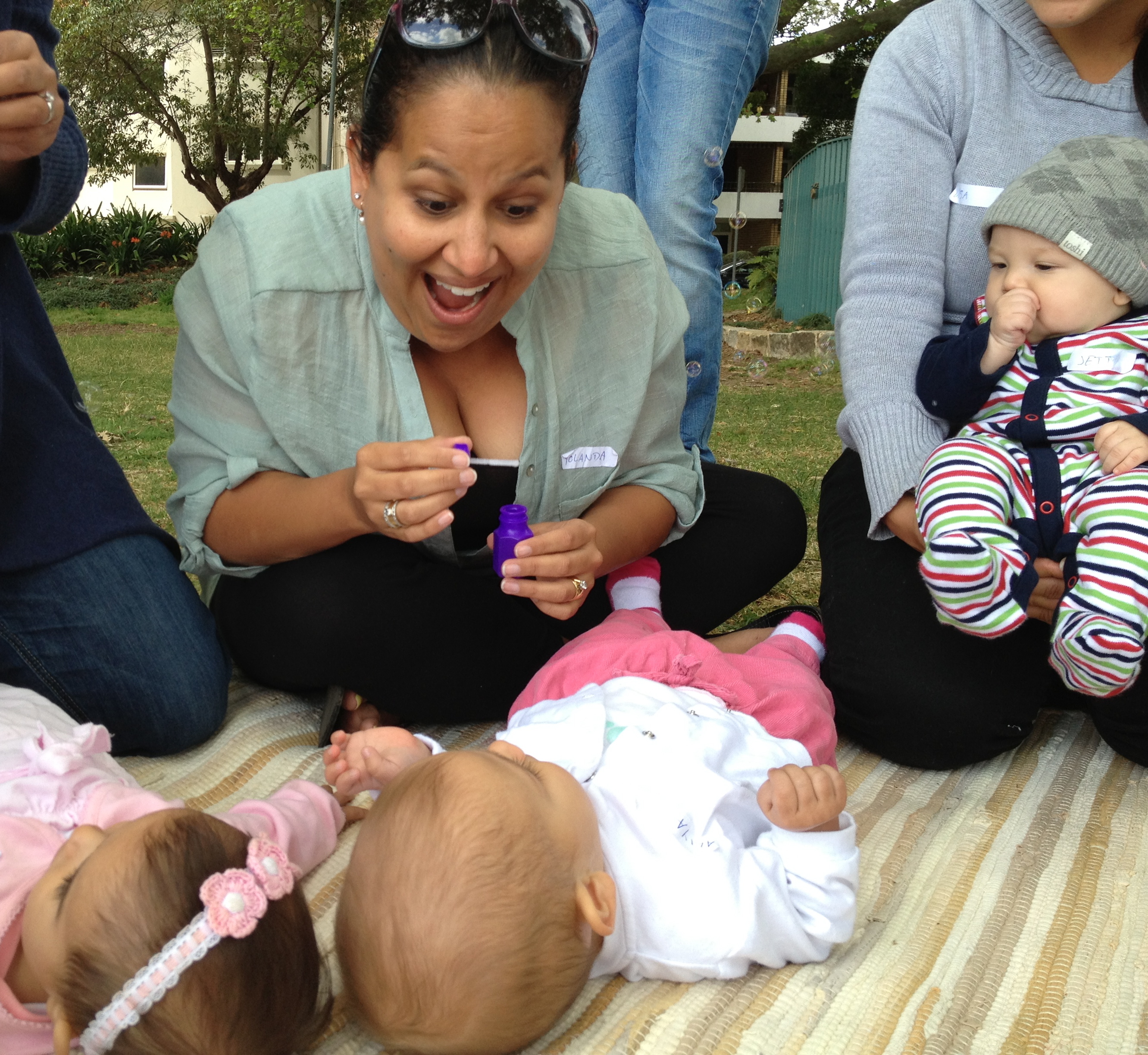 "Caption": "Yolanda blows bubbles for Aliya, and Jett watches closeby!"
