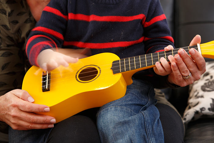 Bec and Hugo playing ukulele